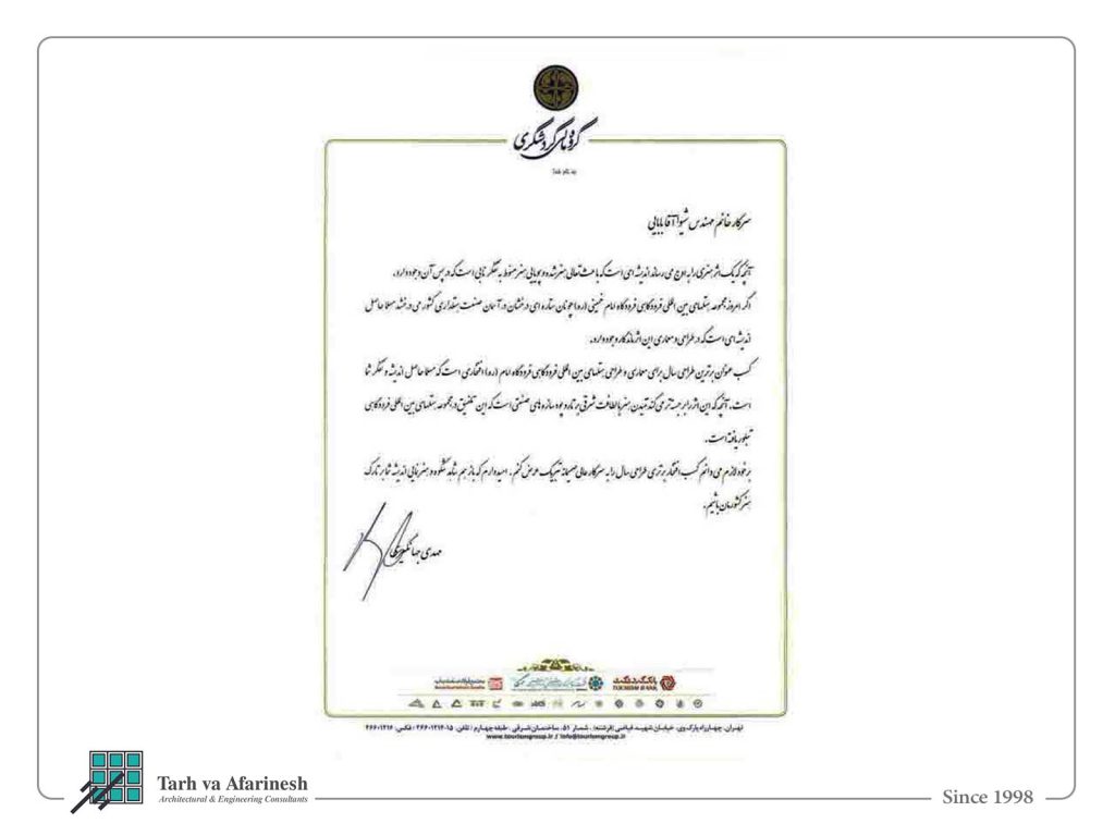 تقدیرنامه صادر شده بابت تکمیل و گشایش هتلهای ۴ و ۵ ستاره فرودگاه امام، نخستین هتلهای فرودگاهی کشور
