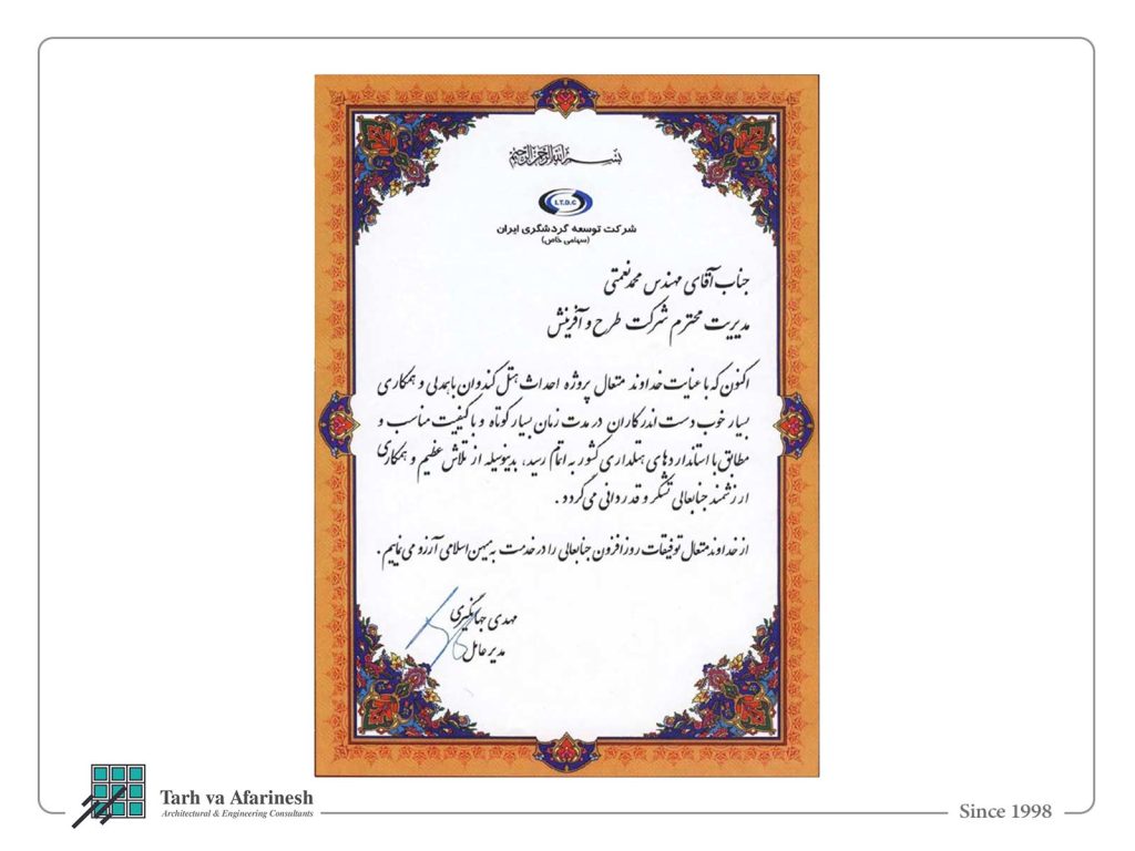 تقدیرنامه صادر شده از سوی شرکت توسعه گردشگری ایران